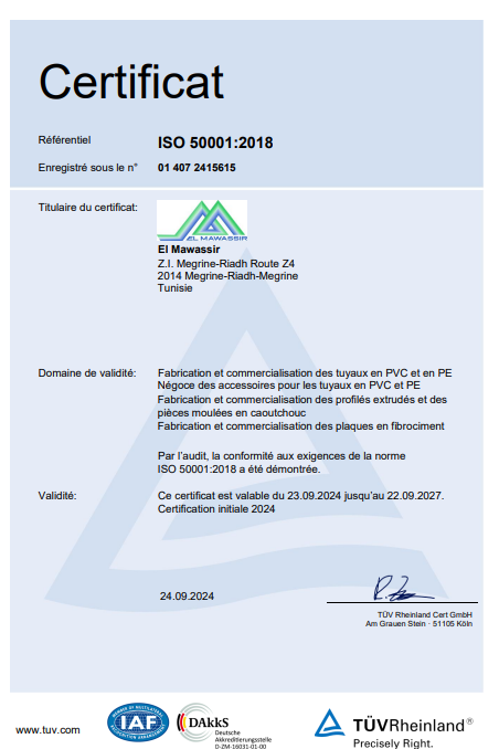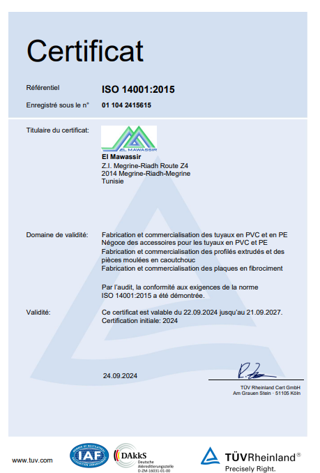 Entreprise responsable et citoyenne, EL MAWASSIR veille à la durabilité environnementale de ses activités, attestée par la certification ISO 14001:2015 puis la certification ISO 5001 :2018. EL Mawassir est également membre engagé du réseau du Pacte Mondial des Nations Unies en Tunisie (Global Compact Network Tunisia).