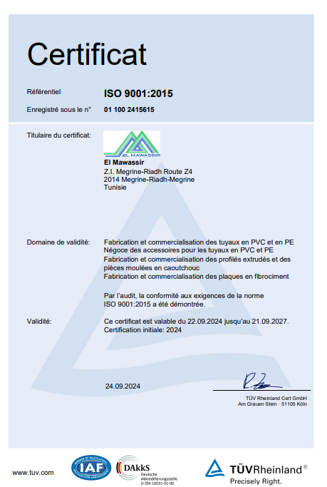 La qualité et la fiabilité sont garanties par des contrôles rigoureux à chaque étape de production, réalisés dans notre laboratoire moderne, avec des tests conformes aux normes tels que NF EN 12201, NF EN 401, NF EN 1452 et NF EN 1555-1. Notre certification ISO 9001:2015 consolide notre engagement envers l’excellence.