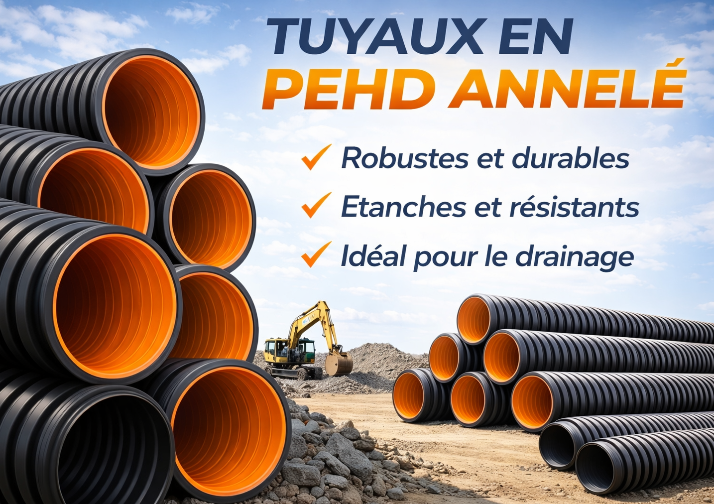 La qualité de nos produits repose également sur des matières premières soigneusement sélectionnées, conformes aux normes internationales et provenant de fournisseurs de confiance. Notre gamme étendue de tuyaux PEHD, PEHD annelé et PVC, du diamètre 16 mm au 1200 mm, couvre quasiment tous les besoins industriels et infrastructurels.